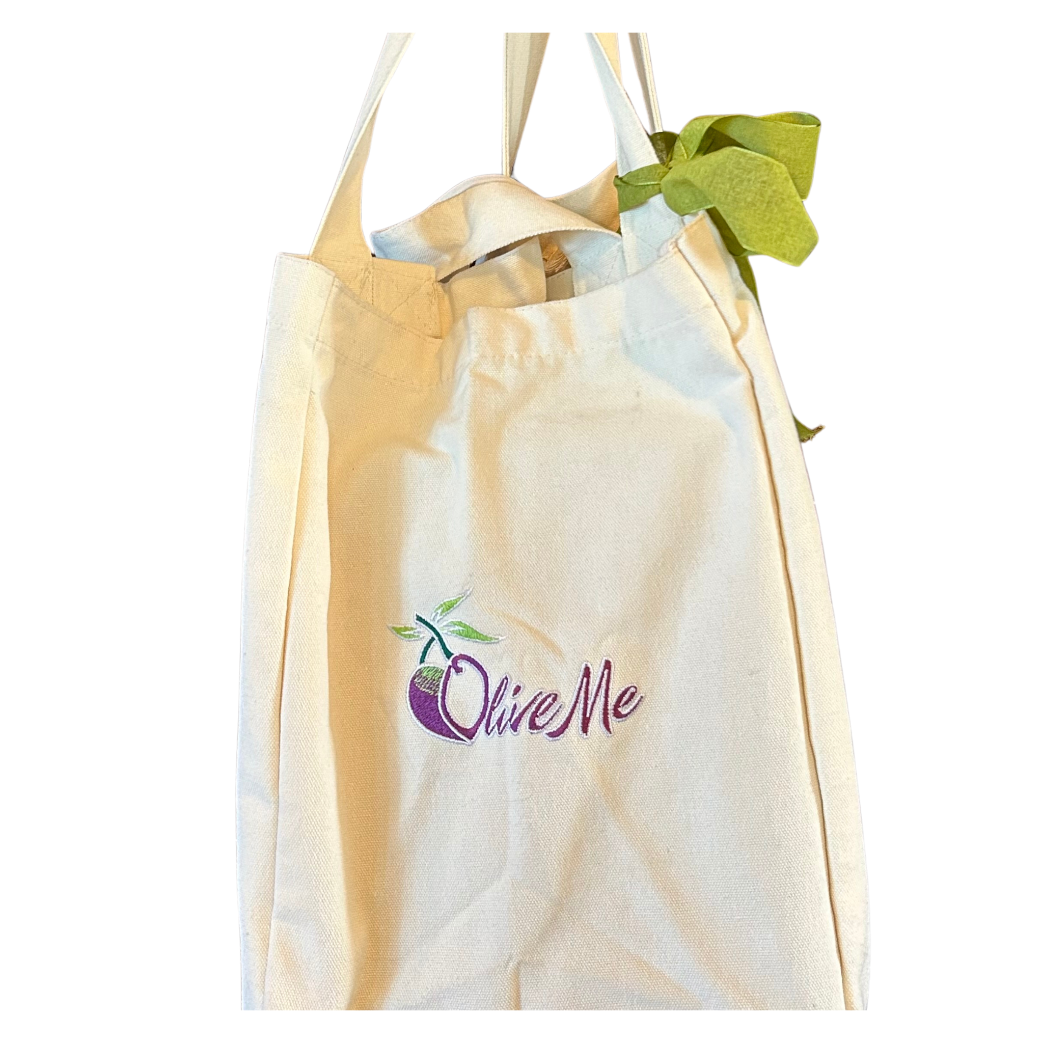 100% Organic Cotton with Internal Pockets, Felt bottom, Shoulder & Hand Straps, Washable & Eco-friendly Tote bag. Accented with a stitched OliveMe logo.