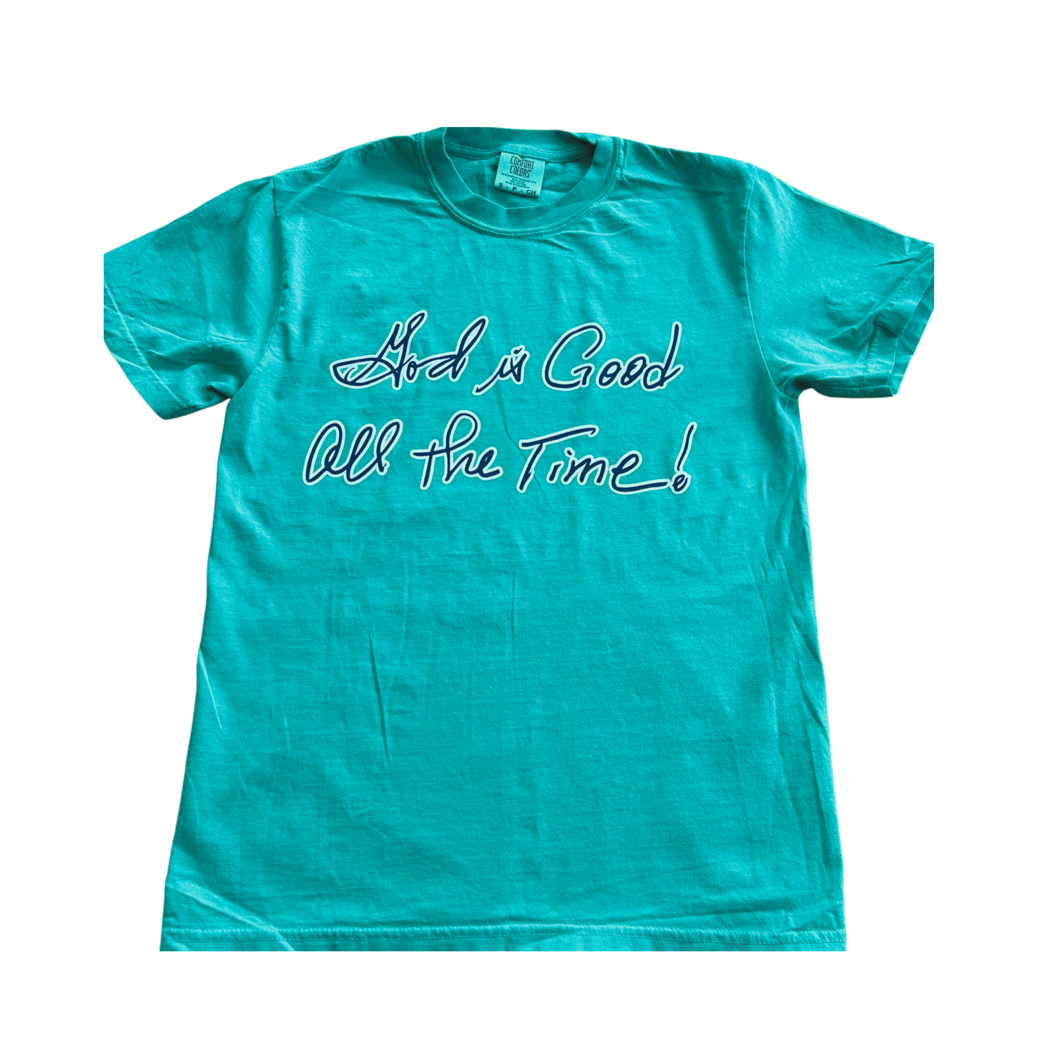 Comfortable, easy fit design for everyday wear. Displaying the God is Good logo, screen print inspired by the handwritten words of Nana – her love of bright colors & cheerful emojis